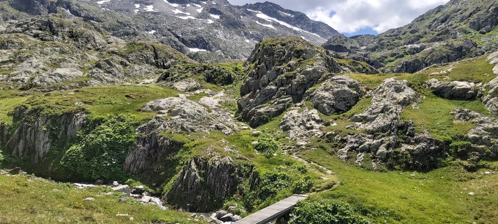 Juste avant Liddes, on traverse la rivière et continuons sur sa rive droite, par le chemin historique de Liddes jusqu’à l’entrée de Bourg-Saint-Pierre. Ce n’est que vers la pause de midi que la vue s’ouvre et que l’on peut découvrir les montagnes que nous allons franchir bientôt. Quelle vue !