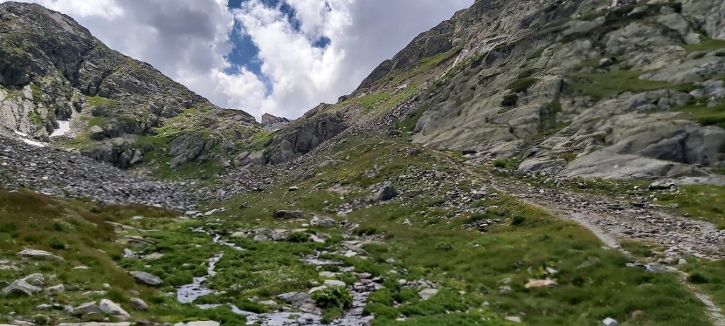 Le chemin grimpe paisiblement le long de la vallée et la vue est belle. Les nuages menaçants qui nous suivaient de près ont fini par prendre un autre cap.