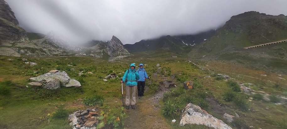 Il a plu beaucoup pendant la nuit et nous craignons le pire, mais lorsque nous nous levons le ciel a l’air découvert. Nous nous remettons en route. Je respire mieux, nous sommes sorties des forêts et avançons vers les sommets enneigés. La végétation est luxuriante. Il y a tellement de fleurs, d’herbes et de senteurs. Nous marchons et nous émerveillons.