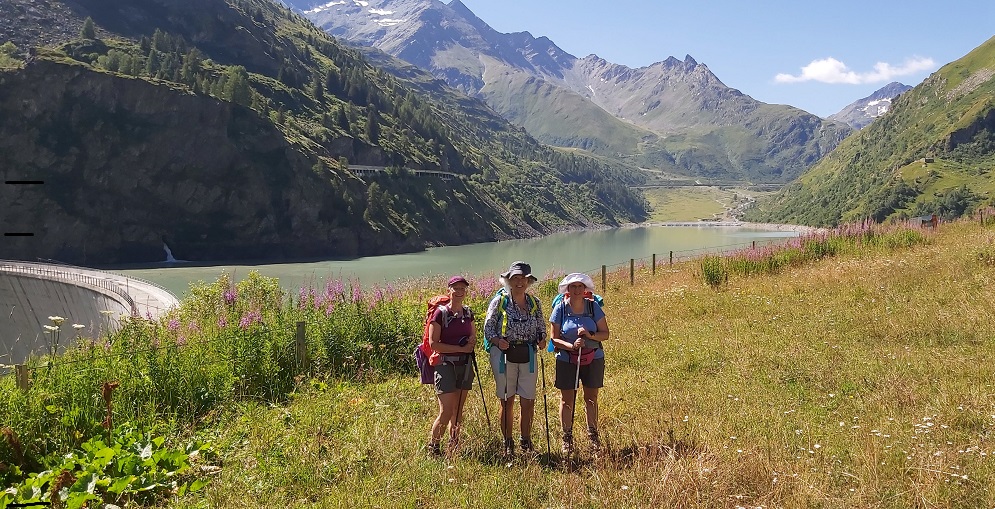 La Via Francigena au passage des Alpes, ce sont 6 étapes pas très longues mais plutôt difficiles. J’ai envisagé de les parcourir seule mais avais trop envie de partager cette expérience extraordinaire avec quelqu’un et ai demandé à Evelyne, mon amie d’il y a très longtemps, et à Noële, ma belle-sœur de longue date aussi, toutes deux bonnes marcheuses et d’excellente compagnie, de m’accompagner. Elles ont accepté sans hésitation et un beau matin du mois de juin nous nous sommes retrouvées à 9 heures du matin à la gare de Martigny pour notre première étape. Pour se mettre dans l’ambiance et tester sa condition physique, Noële était même partie un jour plus tôt pour parcourir en solo les 18 km de l’étape précédente. Elle nous attendait donc devant la gare, telle une pro des pèlerinages.