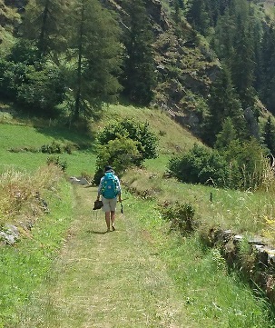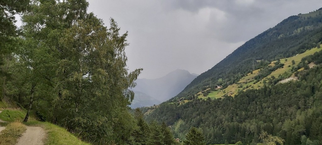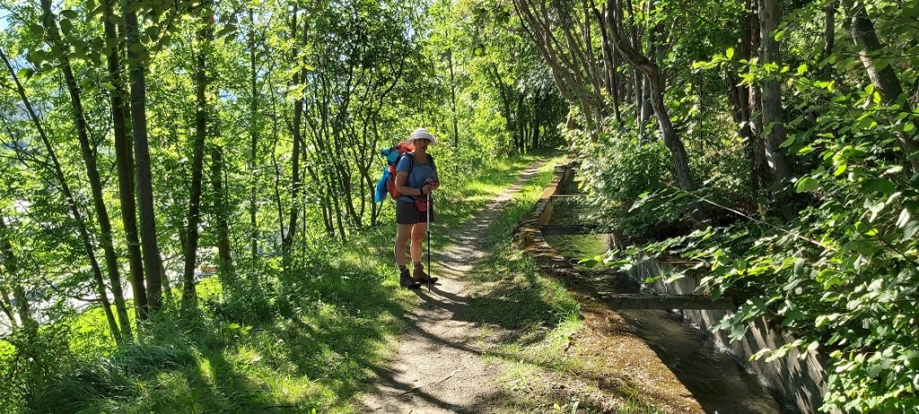 Martigny se trouve dans la plaine du Rhône, au pied des Alpes. La première étape alpine de la VF commence donc par une série de grimpées assez rudes en forêt. Juste en dessous de nous rugit le trafic de la route principale que nous longeons jusqu’à Sembrancher. Souvent le chemin passe par des éboulis et je suis fort reconnaissante à mon frère Pipo de m’avoir prêté ses bâtons.